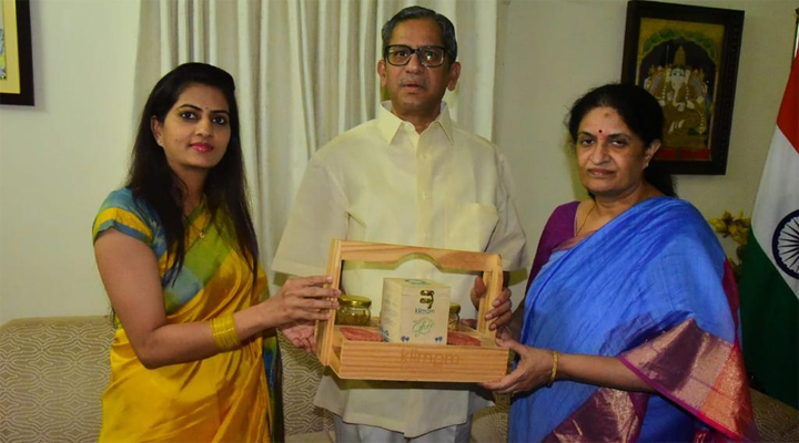 వరంగల్ టైమ్స్, హైదరాబాద్ : సుప్రీంకోర్టు ప్రధాన న్యాయమూర్తి జస్టిస్ ఎన్వీ రమణను క్లిమామ్ వ్యవస్థాపకురాలు అల్లోల దివ్యారెడ్డి మర్యాదపూర్వకంగా కలిశారు. ఎస్ఆర్ నగర్ లోని ఆయన నివాసంలో జస్టిస్ ఎన్వీ రమణ దంపతులను కలిసి క్లిమామ్ గోశాల ఉత్పత్తులను అందజేశారు. దేశీ జాతి ఆవులను సంరక్షించాలనే లక్ష్యంతో క్లిమోమ్ వెల్నెస్ అండ్ ఫార్మ్స్ని 2015 లో ప్రారంభించామని తెలిపారు.