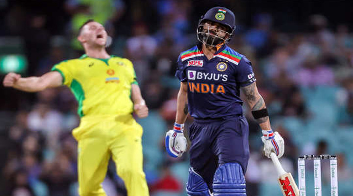 సిడ్నీ: ఆసీస్తో జరిగిన మూడో టీ20 మ్యాచ్లో టీమిండియా జట్టు పోరాడి ఓటమిపాలైంది. ఆసీస్ నిర్ధేశించిన 187 పరుగుల లక్ష్యాన్ని భారత్ చేరుకోలేకపోయింది. కెప్టెన్ విరాట్ కోహ్లీ(85:61 బంతుల్లో 4 ఫోర్లు, 3 సిక్సర్లు) తో ఒంటరి పోరాటం చేసినా విజయాన్ని అందుకోలేకపోయింది. ప్రారంభంలో ఓపెనర్ శిఖర్ ధావన్(28:21 బంతుల్లో3ఫోర్లు), చివరలో హార్ధిక్ పాండ్య(20:13 బంతుల్లో1 ఫోర్, 2 సిక్సర్లు) చేశారు. ఇతర బ్యాట్స్మెన్స్ సహకారం లేకపోవడంతో టీమిండియా 20 ఓవర్లలో 7 వికెట్లకు 174 పరుగులు చేసింది. దీంతో ఆసీస్ 12 పరుగులతో తేడాతో విజయాన్ని దక్కించుకుంది.