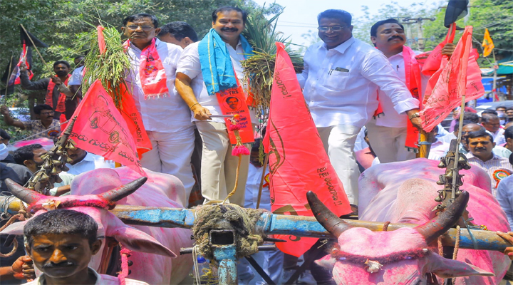 అంతకు ముందు చీఫ్ విప్ దాస్యం వినయ్ భాస్కర్ ప్రొఫెసర్ జయశంకర్ సార్ పార్క్ నుంచి హయగ్రీవ చారి గ్రౌండ్ వద్దకు ఎడ్ల బండ్లతో ర్యాలీగా బయల్దేరి, రైతు నిరసన దీక్షలో పాల్గొన్నారు. ఈ ధర్నా కార్యక్రమంలో మాజీ ఎంపీ సీతారాంనాయక్, రైతు రుణ విమోచన సమితి చైర్మన్ నాగుర్ల వెంకటేశ్వర్లు, కూడా చైర్మన్ సుందర్ రాజ్ యాదవ్, కార్పొరేటర్లు, డీసీసీ చైర్మన్ మార్నేని రవిందర్, టీఆర్ఎస్ నాయకులు, పార్టీ కార్యకర్తలు, రైతులు పెద్ద ఎత్తున పాల్గొన్నారు. కళాకారుల ఆట పాటలతో పాటు, తెలంగాణ ప్రజలపై, రైతులపై బీజేపీ ప్రభుత్వం , బీజేపీ ప్రజాప్రతినిధులు చూపుతున్న వివక్షతను ధర్నా వేదికగా రైతులకు వివరించారు.