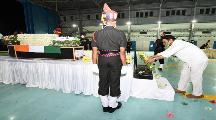 ఆ వీర జవాను పార్థివ దేహానికి తెలంగాణ గవర్నర్ తమిళిసైతో మంత్రులు కేటీఆర్, మహమూద్ అలీ, మల్లారెడ్డి, ఎంపీ రేవంత్ రెడ్డి, డీజీపీ మహేందర్ రెడ్డి తదితరులు పూలమాల వేసి నివాళులర్పించారు. సంతోష్బాబు భార్య, పిల్లలు కూడా అక్కడే ఉన్నారు. ప్రత్యేకంగా అంబులెన్స్లో సంతోష్బాబు పార్థివదేహాన్ని సూర్యాపేటకు తరలించారు.