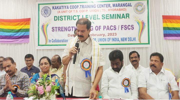 వరంగల్ టైమ్స్, హనుమకొండ జిల్లా : ఒక్కరికోసం అందరం, అందరి కోసం ఒక్కరు అనే స్ఫూర్తితో సహకార సంఘాలు అన్నీ ముందుకు సాగాలని రాష్ట్ర ప్రభుత్వ చీఫ్ విప్ దాస్యం వినయ్ భాస్కర్ పిలుపునిచ్చారు. హన్మకొండలోని ల్యాండ్ మార్క్ బ్యాంక్వెట్ హాల్లో కాకతీయ కోపరేటివ్ శిక్షణ సెంటర్ వారు జిల్లా స్థాయి సెమినార్ నిర్వహించారు. ఈ సెమినార్ కు చీఫ్ విప్ దాస్యం వినయ్ భాస్కర్ ముఖ్య అతిథిగా హాజరయ్యారు.