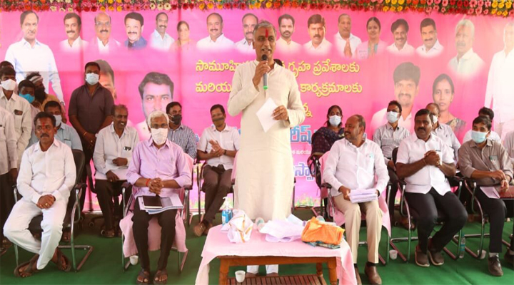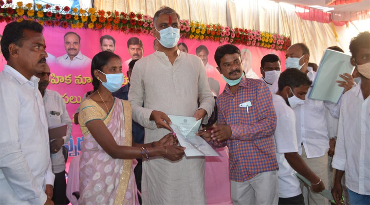 అనంతరం నూతన గృహ లబ్ధిదారులకు ఇళ్ల పట్టాలను మంత్రి చేతుల మీదుగా అందచేశారు. ఈ మేరకు ఏర్పాటు చేసిన సభలో హరీష్ రావు మాట్లాడారు. కేంద్ర ప్రభుత్వం ఇటీవల ప్రవేశపెట్టిన బడ్జెట్ ను మంత్రి దుయ్యబట్టారు. కేంద్రం ప్రభుత్వ రంగ సంస్థలన్నీ అమ్మి ప్రయివేటు కంపెనీలకు ఇస్తే..రిజర్వేషన్లు ఏలా వర్తిస్తాయని.. అలా అమ్మితే ఎస్సీ, ఎస్టీలకు రిజర్వేషన్ వస్తుందా..అంటూ రాజ్యాంగ పరంగా ఎస్సీ, ఎస్టీలకు హక్కులు సంక్రమించాల్సిన అవసరం ఎంతైనా ఉందని పేర్కొన్నారు. ఎస్సీ, ఎస్టీలకు దక్కాల్సిన హక్కులు దక్కాలని సీఎం కేసీఆర్ చెప్పారని, అదానీ, అంబానీల సంస్థల్లో ఎస్సీ, ఎస్టీలకు రిజర్వేషన్లు కల్పిస్తారా..? అందుకే కేసీఆర్ రాజ్యాంగం మార్చాల్సిన అవసరం ఉందని చెప్పినట్లు మంత్రి హరీష్ రావు వెల్లడించారు. దీన్ని కొందరు తప్పుదోవ పట్టిస్తూ, అనవసర రాద్దాంతం చేస్తున్నారని మంత్రి ఆగ్రహం వ్యక్తం చేశారు. ఇక రైతులకు ఇచ్చే అన్ని సబ్సిడీలు తగ్గించి రైతులకు భద్రత లేకుండా చేసిందని బీజేపీ తీరుపై మండిపడ్డారు.
