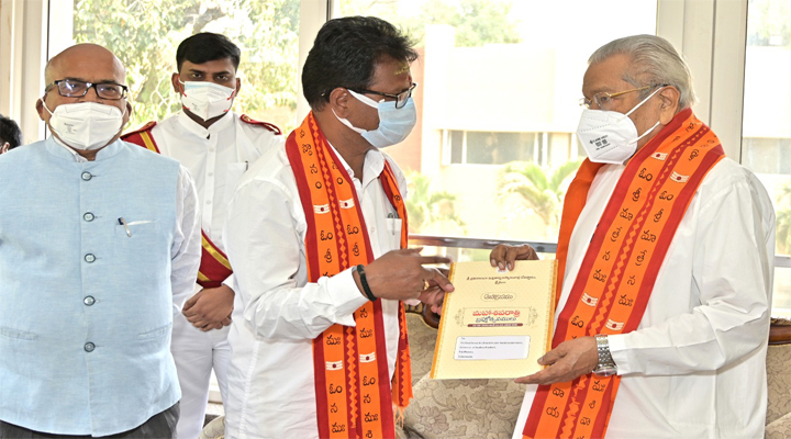 వరంగల్ టైమ్స్, అమరావతి : శ్రీశైలంలోని శ్రీ భ్రమరాంబ సమేత మల్లికార్జున స్వామి దేవస్థానంలో జరిగే మహా శివరాత్రి వేడుకలకు హాజరై, స్వామి ఆశీర్వచనం అందుకోవాలని శ్రీశైలం దేవస్థానం ప్రతినిధులు ఆంధ్ర ప్రదేశ్ గవర్నర్ బిశ్వ భూషణ్ హరిచందన్ కు ఆహ్వానం అందించారు. దేవస్థానం ఈవో లవన్న, ఇతర అధికారులు శుక్రవారం గవర్నర్ ను రాజ్ భవన్ లో కలిసి ఆహ్వాన పత్రికను అందచేశారు. ఈ సందర్భంగా ఆలయ అర్చకులు, వేదపండితులు గౌరవ గవర్నర్ ను ఆశీర్వదించి ప్రసాదాలు, దేవతామూర్తుల చిత్ర పటాలను అందజేశారు. కార్యక్రమంలో గవర్నర్ వారి ప్రత్యేక ప్రధాన కార్యదర్శి ఆర్పీ సిసోడియా తదితరులు పాల్గొన్నారు.