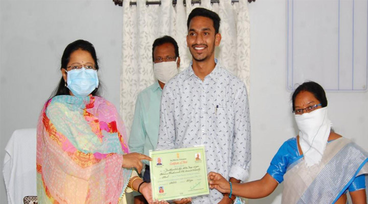 కోవిడ్ 19 వ్యాధి వ్యాప్తి నివారణలో భౌతిక దూరం, లాక్ డౌన్ ప్రభావం అనే అంశంపై రీసెర్చ్ వ్యాసానికి జిల్లా కేంద్రానికి చెందిన విద్యార్థికి రాష్ట్రస్దాయిలో మెరిట్ సర్టిఫికెట్, నగదు బహుమతి రావడం గర్వంగా వుందని కలెక్టర్ అన్నారు. భవిష్యత్తు ఇలాంటి అవార్డులు ఎన్నో అందుకోవాలని కలెక్టర్ అభినందించారు.కె.నిఖిల ఆకాంక్ష వ్యక్తం చేశారు.