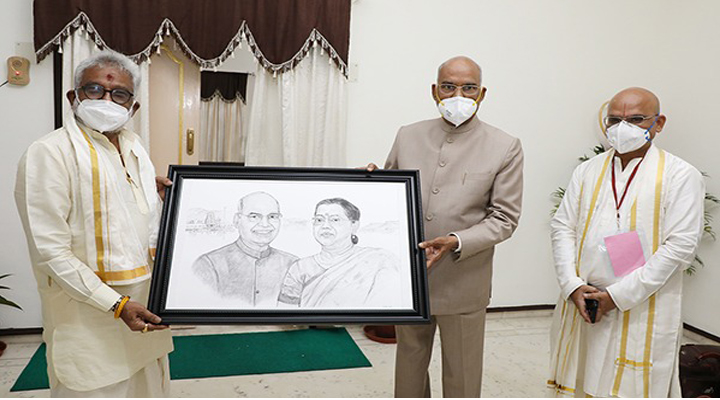తిరుమల: ప్రకాశం జిల్లాకు చెందిన చిత్రకారుడు కత్తి కోటేశ్వరరావు తాను గీసిన రాష్ట్రపతి రామ్నాథ్ కోవింద్ దంపతుల చిత్రపటాన్ని మంగళవారం రాష్ట్రపతికి అందించారు. తిరుమలలోని పద్మావతి విశ్రాంతి గృహంలో టిటిడి చైర్మన్ వైవి.సుబ్బారెడ్డి, ఈవో డాక్టర్ కేఎస్ జవహర్ రెడ్డి చేతుల మీదుగా ఈ చిత్రపటాన్ని రాష్ట్రపతికి అందజేశారు.