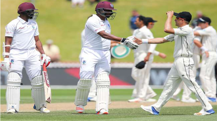 హామిల్టన్: వెస్టిండీస్తో జరిగిన తొలి టెస్ట్లో ఇన్నింగ్స్ 134 పరుగుల భారీ తేడాతో న్యూజిలాండ్ విజయాన్ని తమ ఖాతాలో వేసుకుంది. బ్యాటింగ్, బౌలింగ్లో అదరగొట్టి మ్యాచ్ను ఏక పక్షంగా ముగించింది. తొలి ఇన్నింగ్స్లో 519 పరుగుల భారీ స్కోర్ చేసిన న్యూజిలాండ్ ఆ తర్వాత వెస్టిండీస్ను రెండు ఇన్నింగ్స్ల్లోనూ తక్కువ స్కోర్లకే అలౌట్ చేసి విజయాన్ని సాధించింది. తొలి ఇన్నింగ్స్లో 138 పరుగులకే కుప్పకూలిన వెస్టిండీస్ రెండో ఇన్నింగ్స్లోనూ కేవలం 247 పరుగులకే మ్యాచ్ను ముగించింది. జోసెఫ్ (86)తో కలిసి ఏడో వికెట్కు 155 పరుగులు చేశాడు బ్లాక్వుడ్. వీరు ఇద్దరు తప్పా మిగిలిన బ్యాట్స్మెన్స్ అంతా విఫలకావడంతో విండీస్ భారీ ఓటమి చవిచూసింది.