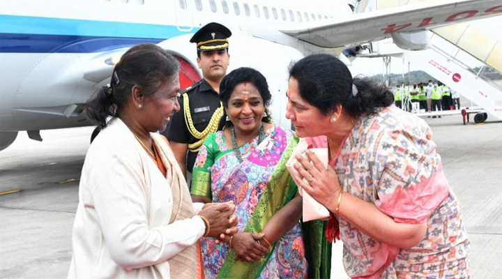 వరంగల్ టైమ్స్, హైదరాబాద్ : శీతాకాల విడిది కోసం రాష్ట్రపతి ద్రౌపది ముర్ము తెలంగాణ రాష్ట్రానికి చేరుకున్నారు. 5 రోజుల పర్యటనలో భాగంగా భారత వాయుసేన విమానంలో శంషాబాద్ చేరుకున్న రాష్ట్రపతికి గవర్నర్ తమిళిసై సౌందరరాజన్, మంత్రి సత్యవతి రాథోడ్ ఘనంగా స్వాగతం పలికారు. ఐతే రాష్ట్రపతి ద్రౌపది ముర్ము శంషాబాద్ నుంచి నేరుగా హెలికాప్టర్ లో శ్రీశైలం వెళ్తున్నారు. శ్రీశైల భ్రమరాంబ మల్లికార్జున స్వామి వారిని దర్శించుకుని ప్రత్యేక పూజలు చేయనున్నారు.