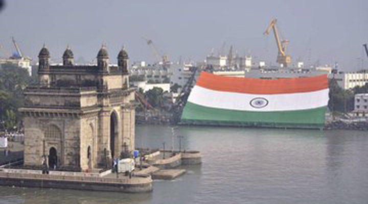వరంగల్ టైమ్స్, ముంబై: నేవీ డే సందర్భంగా ఆర్థిక రాజధాని ముంబైలో ప్రపంచంలోనే అతిపెద్ద జాతీయ జెండాను ప్రదర్శించారు. 225 ఫీట్ల పొడవు, 150 ఫీట్ల వెడల్పు, 1400 కేజీల బరువుతో ఉన్న మువ్వన్నెల పతాకం చూపరులను విశేషంగా ఆకట్టుకుంది. ఖాదీతో తయారు చేసిన ఈ భారీ పతాకాన్ని గేట్ వే ఆఫ్ ఇండియా దగ్గర ఉంచారు.