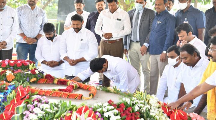వైఎస్ఆర్ కడప జిల్లా : మూడు రోజుల జిల్లా పర్యటనలో భాగంగా ఇడుపులపాయకు వచ్చిన ఏపీ సీఎం వైఎస్ జగన్మోహన్ రెడ్డి 2వ రోజు శుక్రవారం ఉదయం 9.35గంటలకు డాక్టర్ వైయస్సార్ ఘాట్ వద్దకు చేరుకొని డా.వైఎస్ఆర్ కు ఘనంగా నివాళులు అర్పించారు. సీఎంతో పాటు వైయస్సార్ ఘాట్ వద్దకు చేరుకున్న డిప్యూటీ సీఎం ఎస్.బి. అంజద్ భాష, జిల్లా ఇంఛార్జి మంత్రి ఆదిమూలపు సురేష్, మత్స్య శాఖ మంత్రి అప్పలరాజు, ఎంపి వైఎస్ అవినాష్ రెడ్డి, జడ్పీ చైర్మన్ ఆకేపాటి అమర్నాథరెడ్డి, కడప మేయర్ సురేష్ బాబు తదితరులు ఈ కార్యక్రమంలో పాల్గొన్నారు .జిల్లా కలెక్టర్ వి.విజయరామరాజు, ఎస్పీ కేకేఎన్ అన్బురాజన్, పాడా ఓఎస్డి అనిల్ కుమార్ రెడ్డి తదితరులు కూడా కార్యక్రమంలో పాల్గొన్నారు.