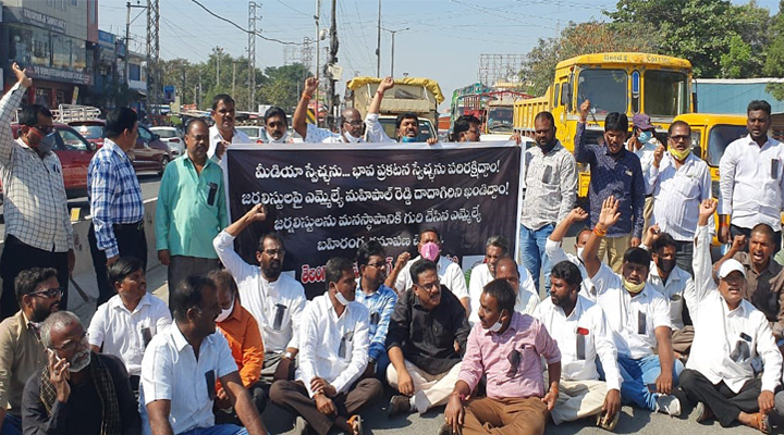 మెదక్ జిల్లా: అధికార దాహంతో జర్నలిస్టులను దూషిస్తే సహించే ప్రసక్తే లేదని తెలంగాణ రాష్ట్ర వర్కింగ్ జర్నలిస్టుల సంఘం (టీయూడబ్ల్యూజే ) రాష్ట్ర ప్రధాన కార్యదర్శి కె.విరాహత్ అలీ హెచ్చరించారు. తెలంగాణ రాష్ట్రంలో వరుసగా జర్నలిస్టులపై అధికారంలో వున్న ప్రజాప్రతినిధులు చేస్తున్న వ్యాఖ్యలు, దూషణలను ఎండగడుతూ టీయూడబ్ల్యూజే ఆధ్వర్యంలో జర్నలిస్టులు మరోసారి గర్జించారు. జర్నలిస్టులపై దాడులను, దూషణలను ఖండిస్తూ బాధిత జర్నలిస్టులకు క్షమాపణ చెప్పాలంటూ పలు దఫాలుగా నిరసనలు కొనసాగిస్తున్నారు. వార్త విలేకరి సంతోష్ నాయక్ పై పటాన్ చెరువు ఎమ్మెల్యే మహిపాల్ రెడ్డి చేసిన అభ్యంతరకర వ్యాఖ్యలు, బెదిరింపులను నిరసిస్తూ గురువారం పటాన్ చెరువులోని తొమ్మిదో నంబర్ జాతీయ రహదారిపై టీయూడబ్ల్యూజే ఆధ్వర్యంలో జర్నలిస్టులు రాస్తారోకో నిర్వహించారు. ఈ ఆందోళన కార్యక్రమంలో ముఖ్యఅతిథిగా పాల్గొన్న టీయూడబ్ల్యూజే రాష్ట్ర ప్రధాన కార్యదర్శి కె.విరాహత్ అలీ మొదట భారత రాజ్యాంగ నిర్మాత అంబేద్కర్ విగ్రహానికి పూలమాల వేసి నివాళులర్పించారు. అనంతరం వరుసగా జర్నలిస్టులపై ప్రజాప్రతినిధులు వ్యవహరిస్తున్న తీరును ఆయన ఖండించారు. వీధి గూండాల్లా జర్నలిస్టుల పట్ల వారు అనుసరిస్తున్న ప్రవర్తనతో సభ్యసమాజం సిగ్గుపడుతుందని ఆవేదన వ్యక్తం చేశారు. బాధ్యతాయుతమైన పదవిలో వున్నామనే విషయాన్ని మరచి వాస్తవాలు వెలుగులోకి తెస్తున్న జర్నలిస్టుల పట్ల అసహనాన్ని ప్రదర్శించడం విచారకరమన్నారు. వరుసగా నారాయణ్ ఖేడ్ ఎమ్మెల్యే భూపాల్ రెడ్డి, దుబ్బాక ఎమ్మెల్యే రఘునందర్ రావు, మల్కాజిగిరి ఎమ్మెల్యే మైనంపల్లి హన్మంతరావు, తాజాగా పటాన్ చెరువు ఎమ్మెల్యే మహిపాల్ రెడ్డిలు జర్నలిస్టులపై చేసిన వ్యాఖ్యలు, హెచ్చరికలు రాజ్యాంగాన్ని అవమానపరిచే విధంగా వున్నాయని విరాహత్ అలీ ధ్వజమెత్తారు. రాజ్యాంగేతర శక్తులు ఏ స్థాయిలో వున్నా వారికి తగిన రీతిలో గుణపాఠం చెప్పిన చరిత్ర తెలంగాణ జర్నలిస్టులకు వుందనే సత్యాన్ని రాజకీయనాయకులు మరిచిపోరాదని ఆయన సూచించారు. ఇందుకు నిదర్శనంగా 2001లో పటాన్ చెరువు ఎంపిపి అధ్యక్షుడిగా కొనసాగిన మహిపాల్ రెడ్డి తన తమ్ముడు మధుసూదన్ రెడ్డి ద్వారా అప్పటి వార్త విలేకరి శంకర్ రావుపై దాడి చేయించగా నాటి ఏపీయూడబ్ల్యూజే అతనికి తగిన బుద్ధి చెప్పిందని విరాహత్ గుర్తుచేశారు. ఎమ్మెల్యే మహిపాల్ రెడ్డి బేషరతుగా బహిరంగ క్షమాపణ చెప్పాలని ఆయన డిమాండ్ చేశారు. అయితే రెండు రోజుల క్రితమే అమీన్ పూర్ పోలీస్ స్టేషన్ లో ఎమ్మెల్యే మహిపాల్ రెడ్డిపై అట్రాసిటీ కేసు నమోదైనప్పటికీ అతన్ని అరెస్ట్ చేయడంలో జాప్యం ఎందుకంటూ పోలీసులను ప్రశ్నించారు. ఈ ఆందోళన కార్యక్రమంలో టీయూడబ్ల్యూజే రాష